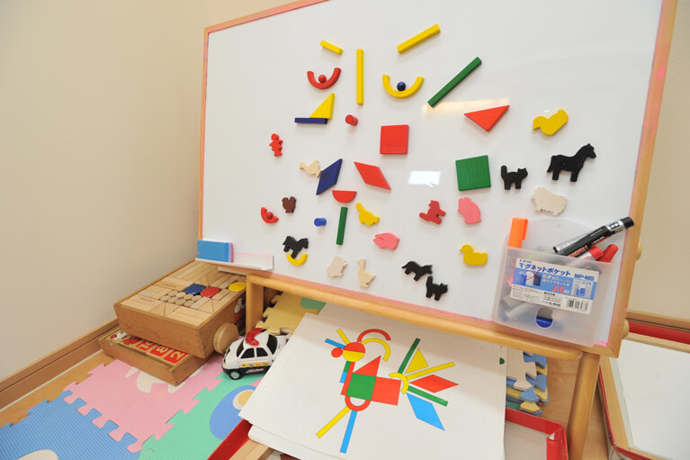 診療受付など落ち着いてして頂けるように、椅子を配置してあります。待合室での空気感染症対策として各椅子毎に高さ180㎝以上のアクリル板壁設置、空気清浄機、換気扇、呼排気装置、サーキュレターなどにより空気の気流を起こし強制換気を促し、感染防護も務めております。履物に関しても他の方が使われたスリッパ等は洗剤消毒後、アルコール消毒し、その後紫外線殺菌とオゾンによる不活性化消毒を行っております。入室時の検温、手指のアルコール消毒は勿論ですが、お連れのお子さんが走り回っても、危なく無いように、机の角は丸めています。勝手に外に飛び出し難いよう扉を自動、手動の二重にし、自動扉もガラスに触れるぐらいの距離にセンサーのついた扉にしています。